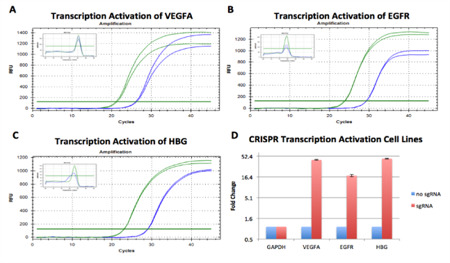 CRISPRa controls GeneHero™ CRISPRa Stable Cell Lines- The CRISPRa cell lines have stably integrated human codon-optimized dCas9 fused at the C-terminus of transcriptional activator VP64, and activation helper protein complex MPH (MS2-p65-HSF1).