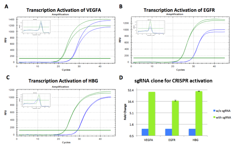 The MPH complex, dCas9-VP64 and sgRNA were co-overexpressed in HEK293 cells. The transcriptional activity of VEGFA (Figure A), EGFR (Figure B), and HBG (Figure C) was detected by qPCR. The cell proliferation curves for cells transduced with sgRNA are shown in green, while those for cells without sgRNA transduction are shown in blue. The transcriptional levels of the target genes were compared with those of GAPDH, indicating a significant increase in the transcriptional levels of the target genes in HEK293 cells.