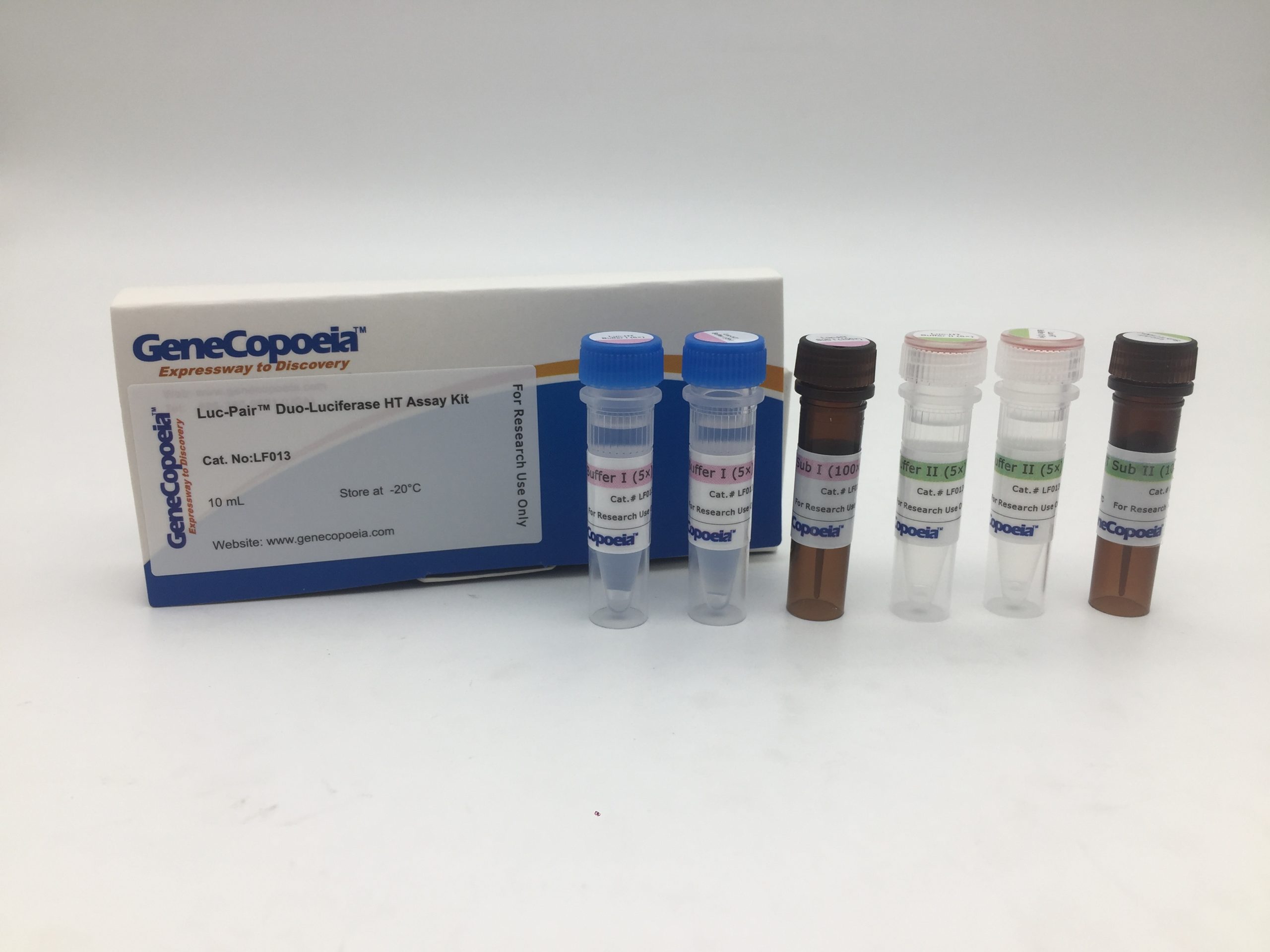 GeneCopoeia’s Luc-Pair™ Duo-Luciferase HT Assay Kit is a convenient system for high-throughput detection of Firefly luciferase (FLuc) and Renilla luciferase (Rluc) activities in 96- or 384-well plates. The Luc-Pair™ Duo-Luciferase HT Assay reagents can be added directly to cells in growth medium without washing or preconditioning, and are optimized for use with many different media containing 0–10% serum (e.g. DMEM, RPMI1640, etc.) Firefly luciferase luminescence is produced by one reagent, while a second reagent simultaneously quenches the Firefly luciferase and produces Renilla luciferase luminescence.