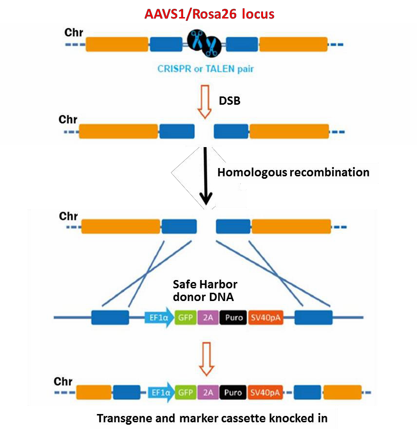 Genome editing is an approach for making specific changes to targeted regions of genomic DNA (for reviews, see Bogdanove & Voytas, 2011; van der Oost, et al., 2013). Two genome editing technologies have emerged recently that exploit bacterial systems for plant pathogenesis or adaptive immunity: TALEN (Transcription Activator-Like Effector Nucleases) and CRISPR (Clustered, Regularly Interspaced, Short Palindromic Repeats), respectively. Both TALEN and CRISPR are chimeric endonucleases that initiate double-strand break (DSB) formation at virtually any target sequence in genomes, leading to mutagenesis. Genome editing has many applications, including gene knock out, gene tagging, and correction of genetic defects, to name a few. In addition, genome editing methodology can be used to introduce transgenes at any locus, including the Rosa26 and AAVS1 Safe Harbor loci. In such a scenario, the TALEN- or CRISPR-induced DSB is repaired by homologous recombination in the presence of a donor
