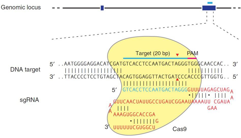 | Figure 3. Recruitment of Cas9 to a target locus by an sgRNA. Red sequences, sgRNA scaffolding. Blue, target sequence. The PAM is indicated by the red bar. The sgRNA target sequence binds to the strand opposite the PAM site. Cas9 cuts both sDNA strands between the third and fourth nucleotide 5’ of the PAM. Red arrows: Position of the DNA strand cuts. From Ran, et al. (2013). |